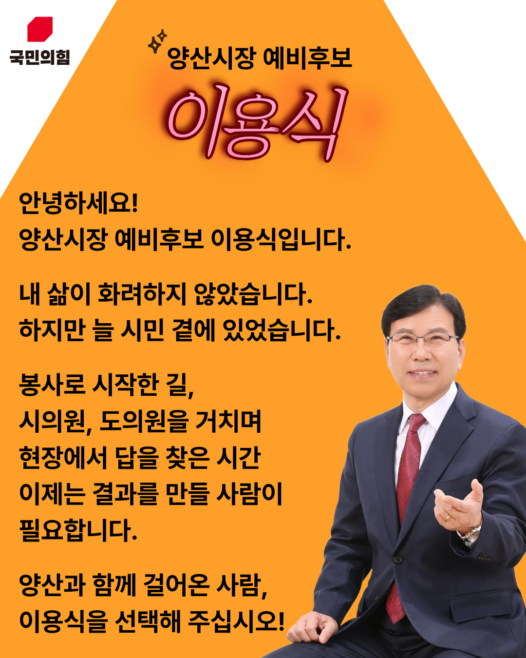 국민의힘 이용식 양산시장 예비후보.(사진제공=이용식 예비후보 선거사무소)출처 : 세계뉴스통신(https://www.segyenewsagency.com) [세계뉴스통신/경남 양산=임영태 기자]=국민의힘 경남 양산시장에 출마한 이용식 예비후보가 최근 각종 여론조사 집계에서